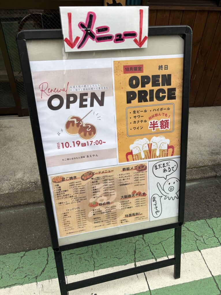ただ新店舗は「黒毛和牛と農家たくちゃん」のグループ店舗であり、店舗名は『たこ焼きとほるもん酒場 ゑえやん』。これは引き続きホルモン料理のDNAを引き継ぎいでくれていそうで嬉しいですね。