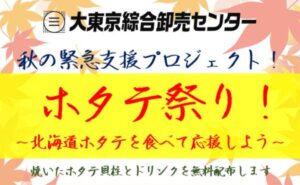 東京都府中市、大東京綜合卸売センター (府中市場)で『秋の緊急支援プロジェクト!ホタテ祭り!~北海道ホタテを食べて応援しよう~』が2023年11月25日(土)に開催されます。