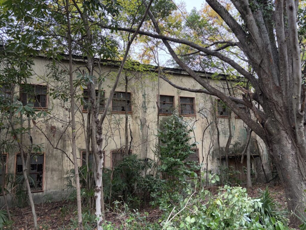 ここが「府中基地跡地留保地」と呼ばれる場所で、フェンス越しに中を覗くと建物も見えたりします。なんかもう窓ガラスとか割れてるし、そのままお化け屋敷にしたら人気出そう。