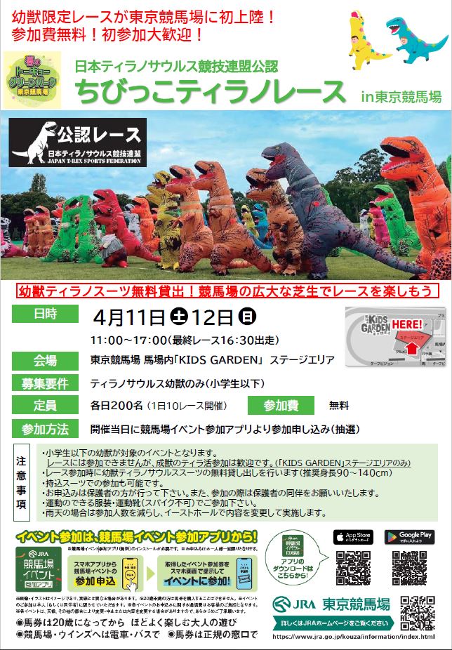 個人的に一番推したいのが、4月11日(土)・12日(日)に開催される「ちびっこティラノレース」です。