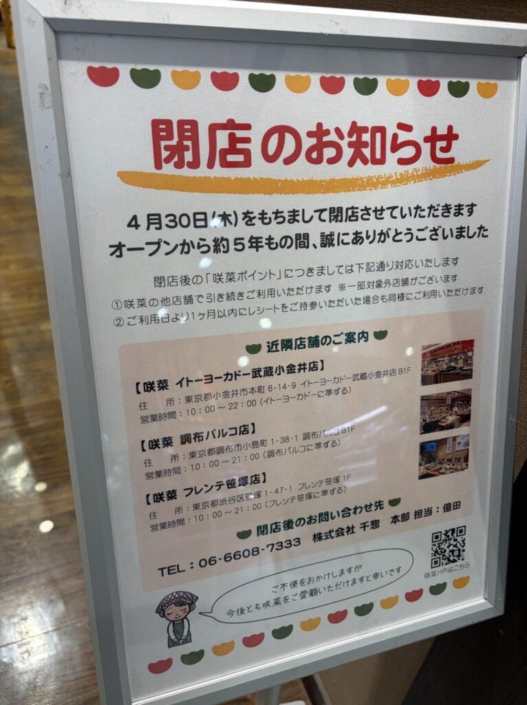 咲菜 ミッテン府中店が2026年4月30日で閉店へ